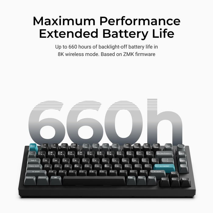 Featuring an industry-leading 8K polling rate for near-zero-latency response and powered by open-source ZMK firmware, the Q Ultra 8K Keyboards deliver an exceptional battery life of up to 660 hours even in 8K mode.